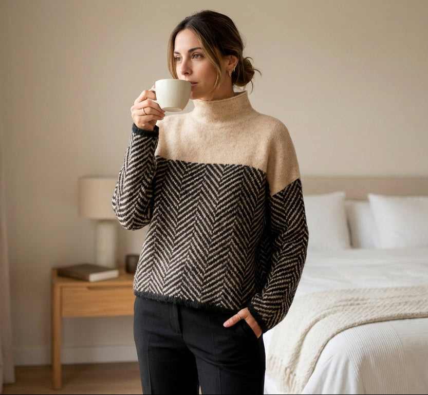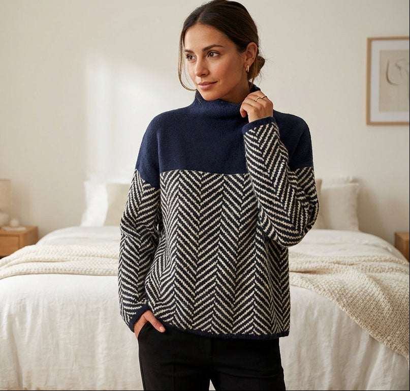 Jersey de punto diseñado para aportar abrigo y estilo en los días más frescos. Presenta un cuello alto amplio que envuelve suavemente el cuello, aportando un aire moderno y sofisticado. Su diseño combina una parte superior lisa con un estampado geométrico en zigzag en contraste, que añade textura y carácter a la prenda.
