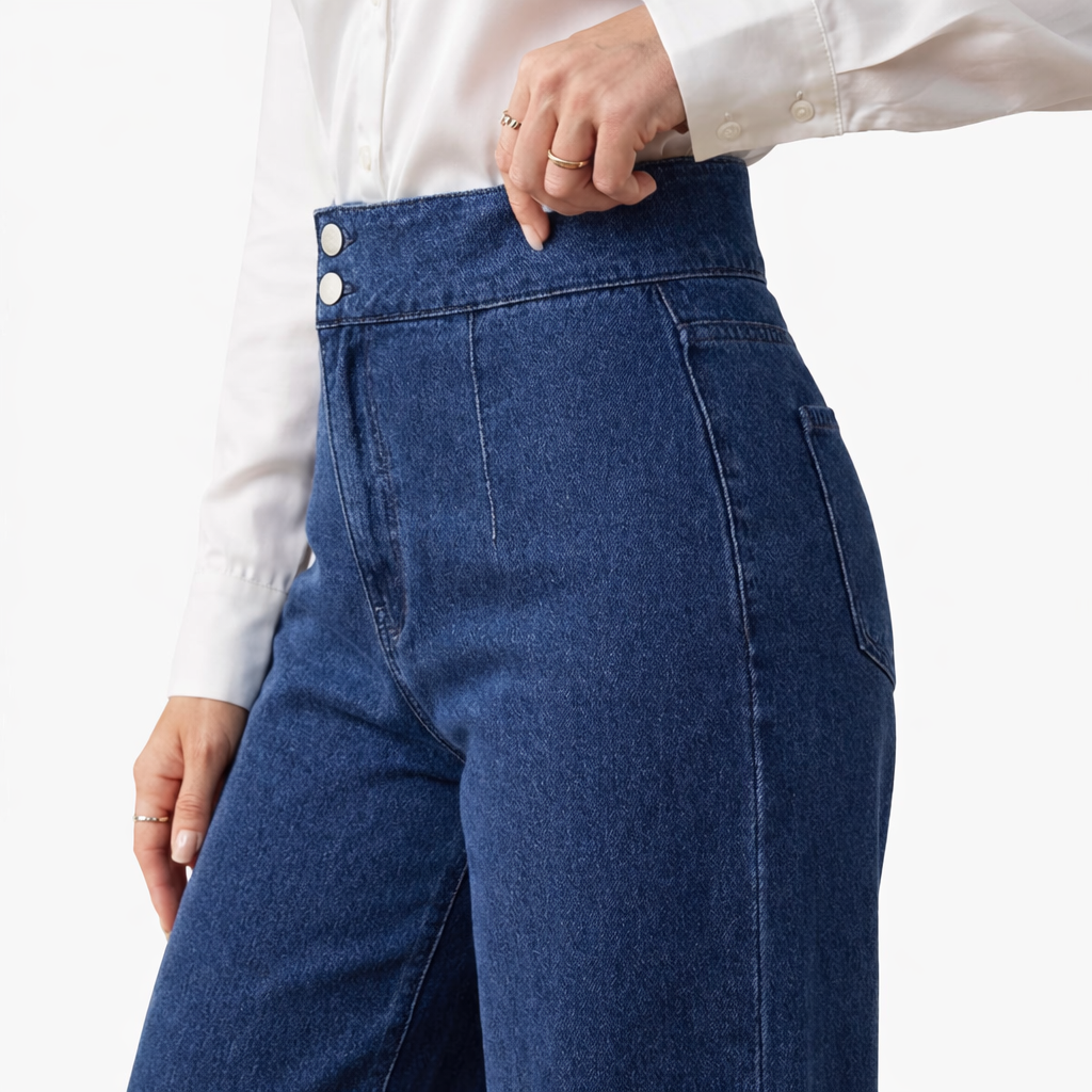 Confeccionados en denim de calidad, ofrecen una estructura firme pero confortable, ideal para el uso diario. El cierre frontal con doble botón añade un detalle distintivo y asegura un ajuste perfecto en la cintura.